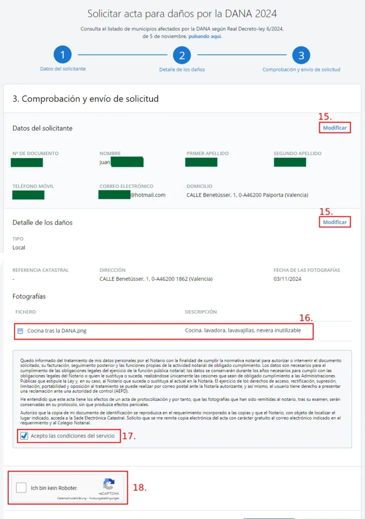 Este es el paso final antes de enviar tu solicitud para el acta notarial por los daños causados por la DANA. Aquí tienes un resumen de todos los datos ingresados hasta ahora. Es esencial revisarlos con cuidado antes de continuar.