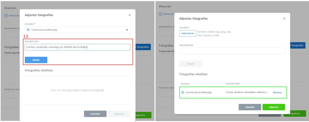 Además, se permite adjuntar hasta 14 fotografías que evidencien los daños, lo cual es una gran ventaja para documentar de forma precisa la magnitud de los mismos.